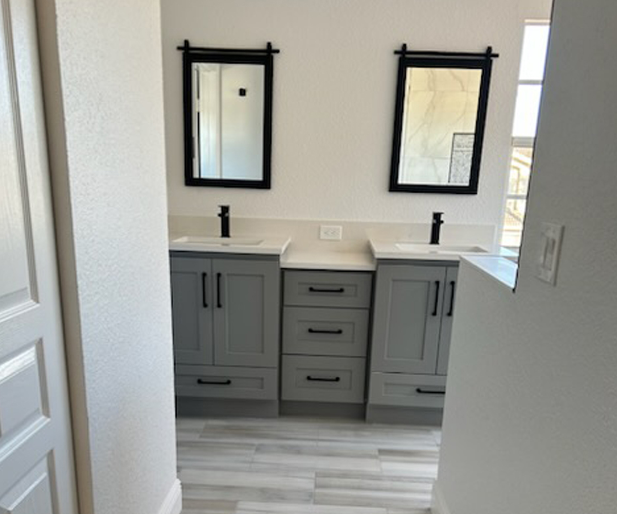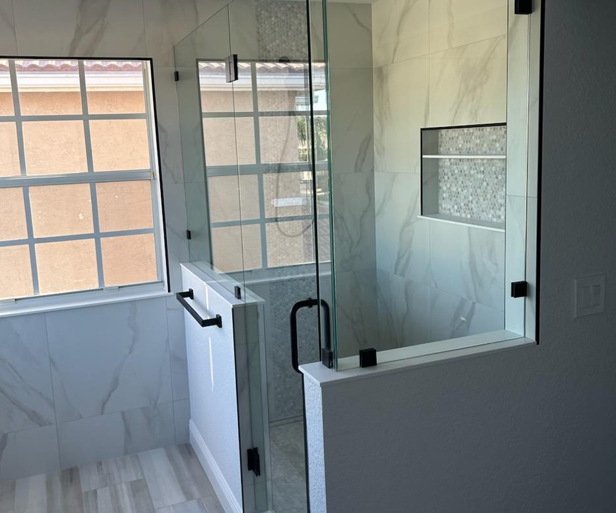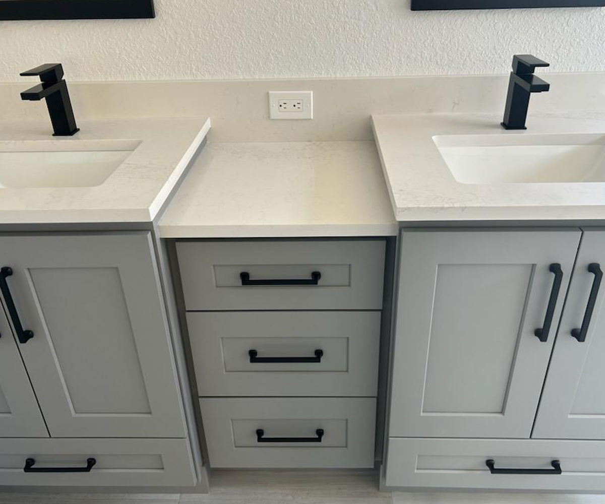 Greenacres, Florida. A linen closet was removed to increase the footprint of the shower. Large format tile was used in combination with mosaics to create a rustic modern concept and custom cabinetry was used for a 2-tier vanity setup