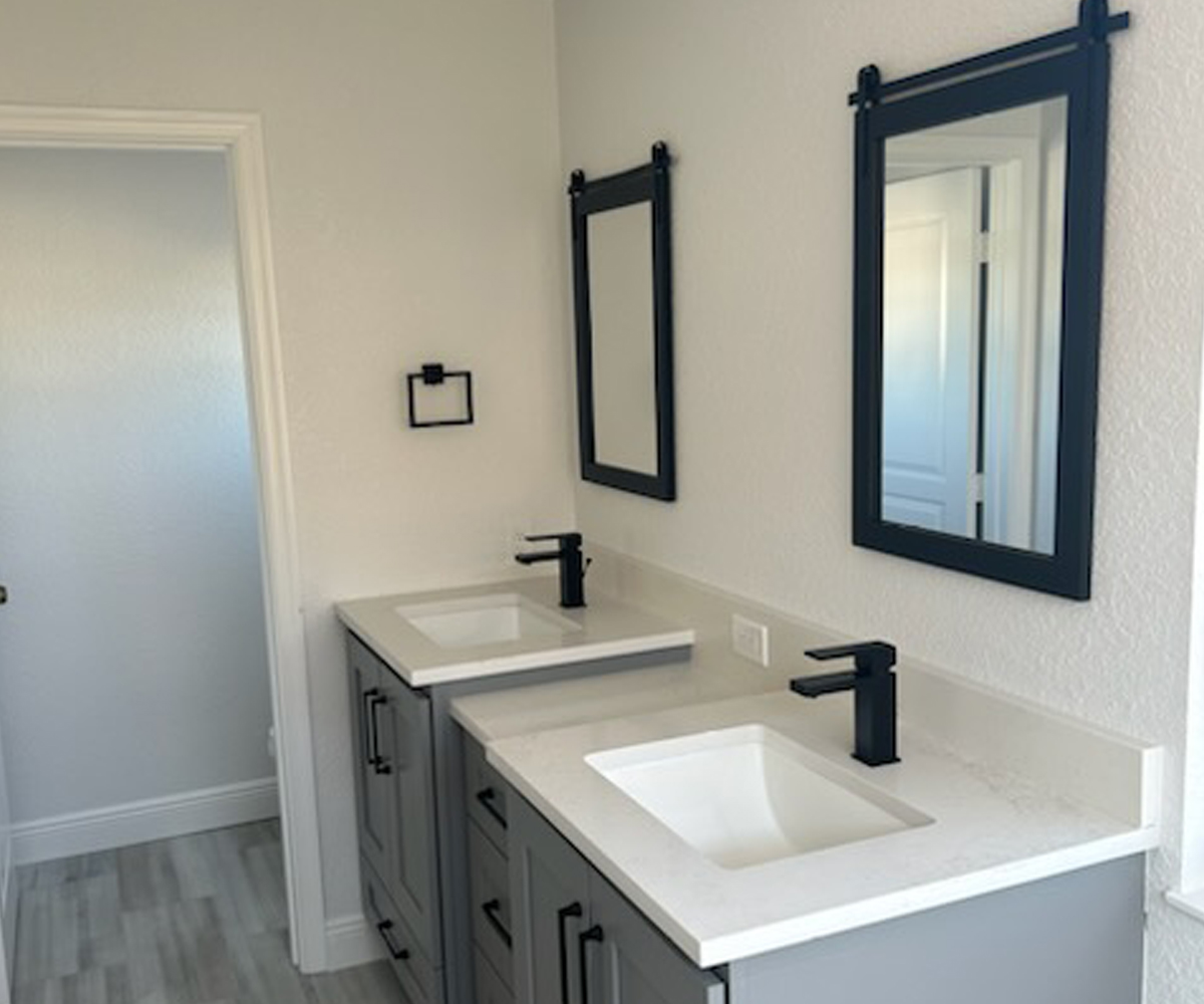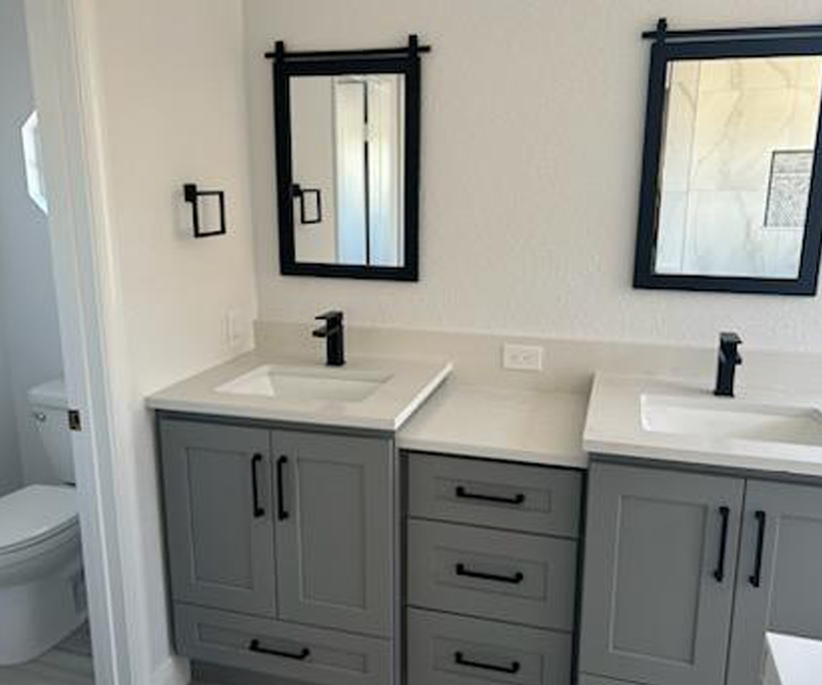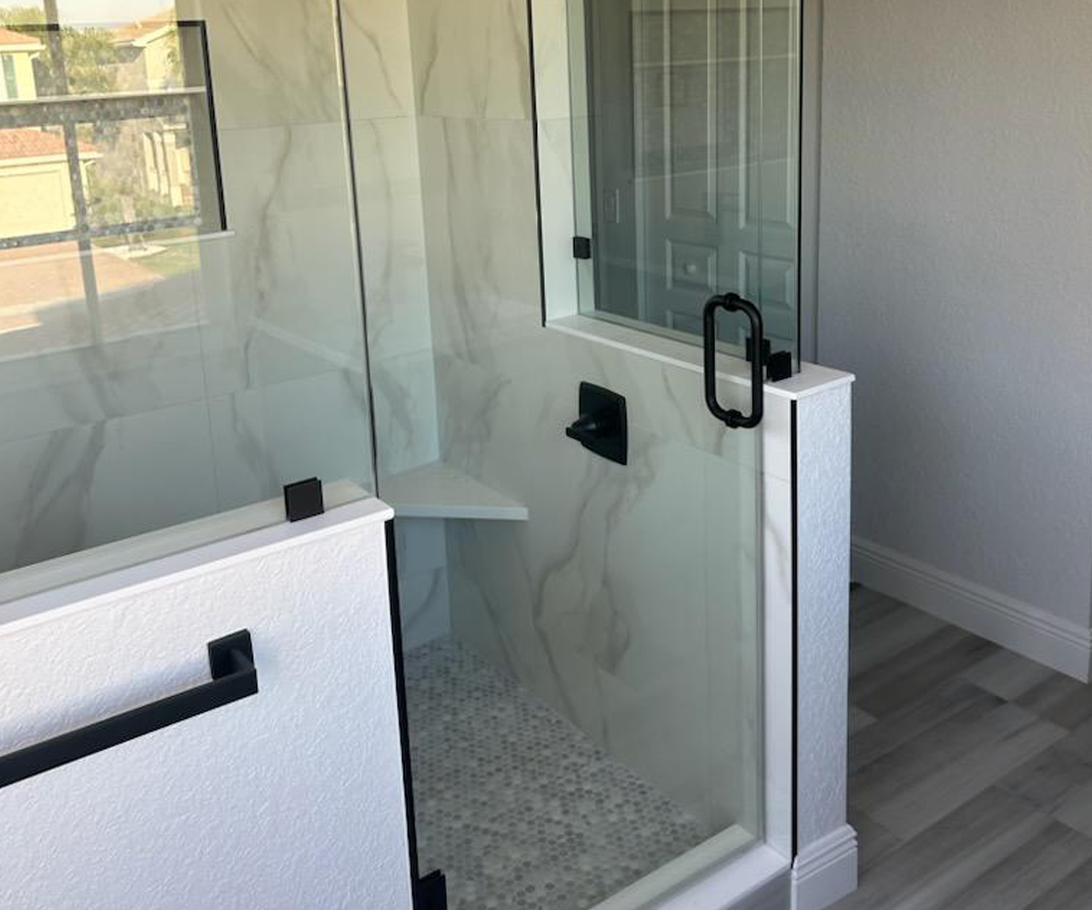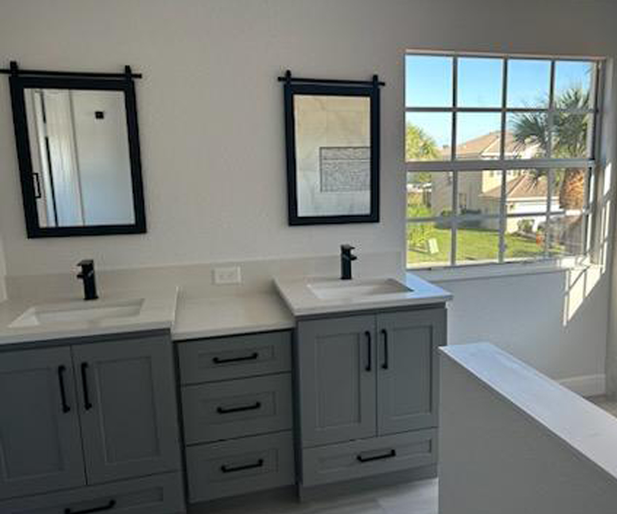 Greenacres, Florida. A linen closet was removed to increase the footprint of the shower. Large format tile was used in combination with mosaics to create a rustic modern concept and custom cabinetry was used for a 2-tier vanity setup