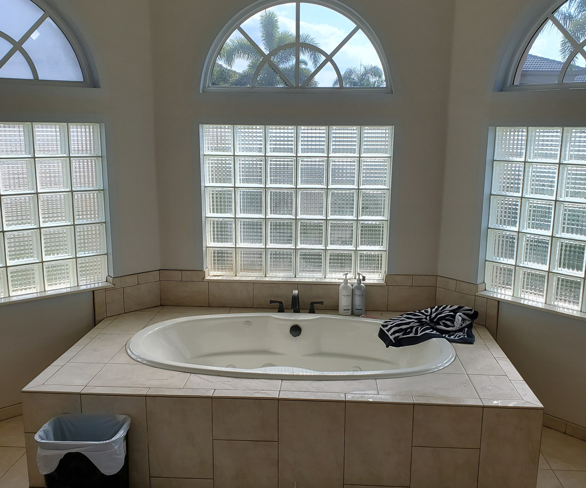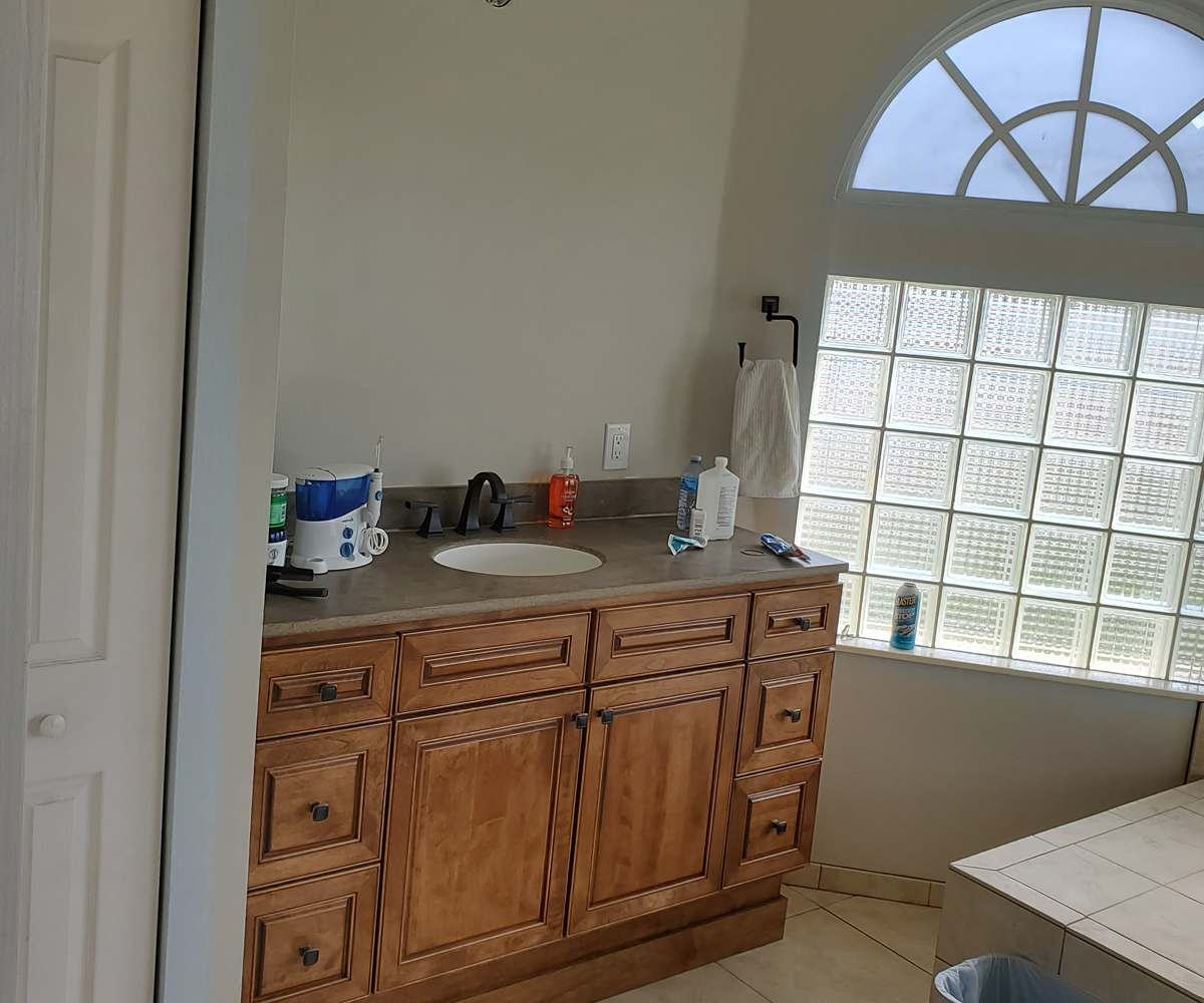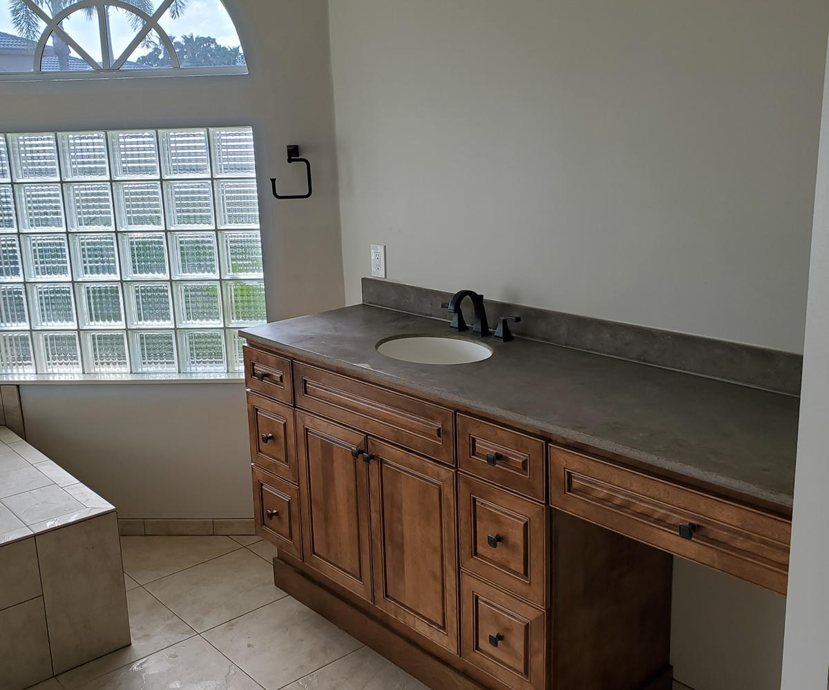 Royal Palm Beach, Florida. You cant go wrong with a rustic theme, especially with this oversized layout! We incorporated large format tile, an oversized soaker tub, custom cabinetry and corian countertops