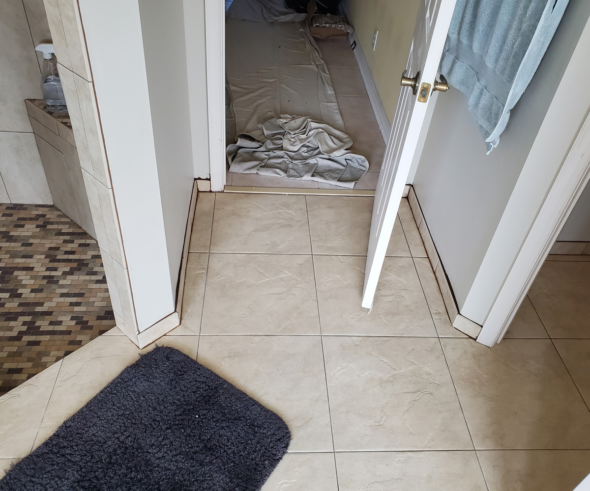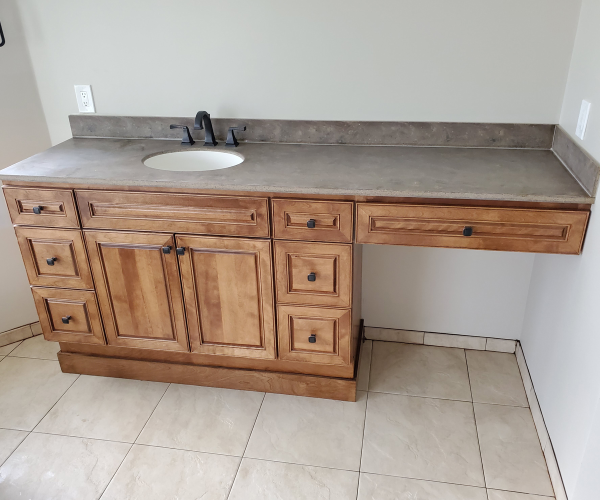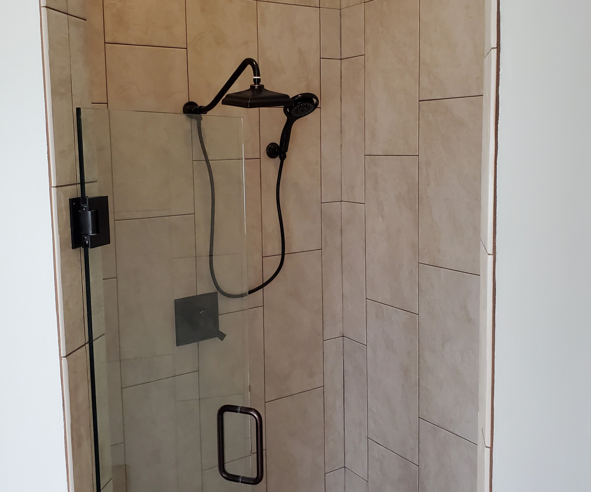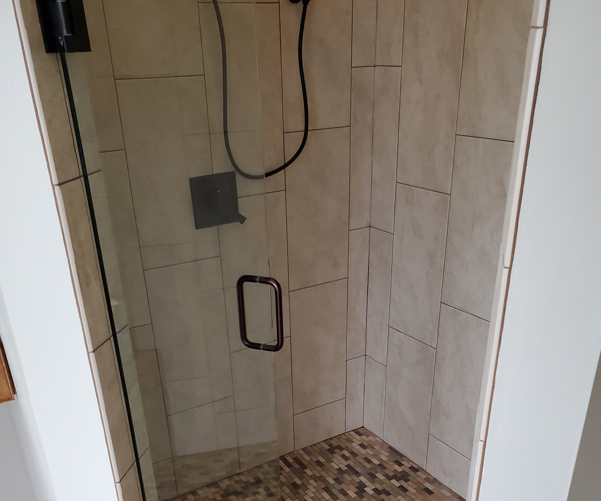 Royal Palm Beach, Florida. You cant go wrong with a rustic theme, especially with this oversized layout! We incorporated large format tile, an oversized soaker tub, custom cabinetry and corian countertops
